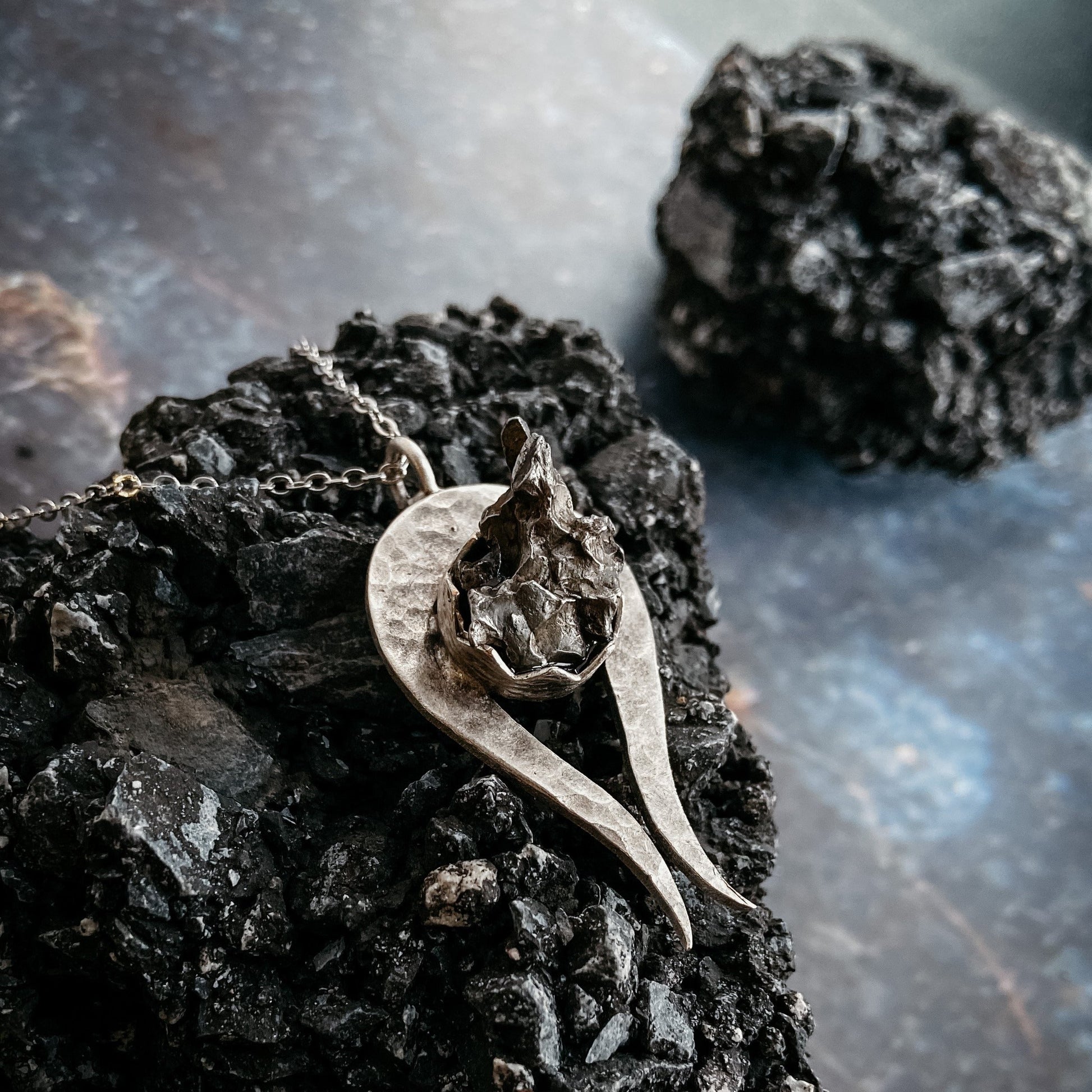 Materials: silver plated brass, authentic Campo del Cielo meteorite, and choice of leather chain or rhodium plated brass chain
